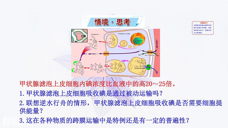 甲状腺滤泡上皮细胞内碘浓度比血液中的高20~25倍。1.甲状腺滤泡上皮细胞吸收碘是通过被动运输吗?2.联想逆水行舟的情形,甲状腺滤泡上皮细胞吸收碘是否需要细胞提供能量?3.这在各种物质的跨膜运输中是特例还是有一定的普遍性?