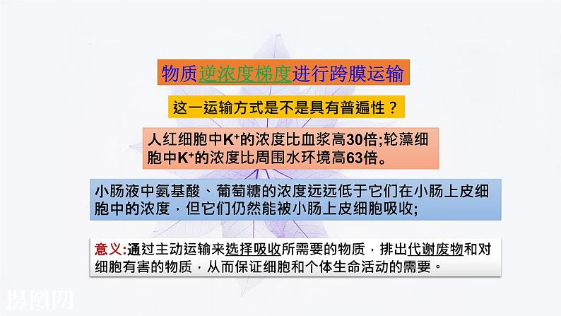 人红细胞中K+的浓度比血浆高30倍;轮藻细胞中K+的浓度比周围水环境高63倍。
