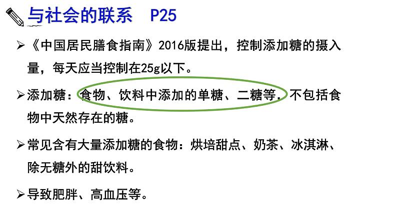 《中国居民膳食指南》2016版提出,控制添加糖的摄入量,每天应当控制在25g以下。添加糖:食物、饮料中添加的单糖、二糖等,不包括食物中天然存在的糖。常见含有大量添加糖的食物:烘培甜点、奶茶、冰淇淋、除无糖外的甜饮料。导致肥胖、高血压等。
