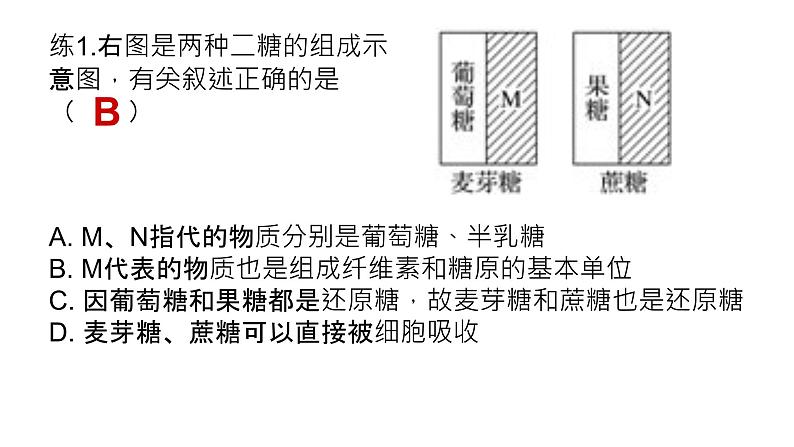 练1.右图是两种二糖的组成示意图,有关叙述正确的是( ) A. M、N指代的物质分别是葡萄糖、半乳糖B. M代表的物质也是组成纤维素和糖原的基本单位C. 因葡萄糖和果糖都是还原糖,故麦芽糖和蔗糖也是还原糖D. 麦芽糖、蔗糖可以直接被细胞吸收