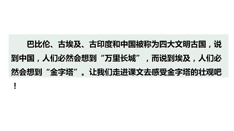 巴比伦、古埃及、古印度和中国被称为四大文明古国,说到中国,人们必然会想到“万里长城”,而说到埃及,人们必然会想到“金字塔”。让我们走进课文去感受金字塔的壮观吧!