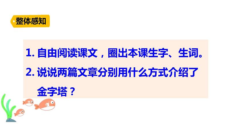 1. 认识“译、愧”等生字,读准多音字“澄、着”。2. 读读课文,初步体会金字塔的雄伟与神秘,了解两篇文章介绍金字塔的方式有什么不同。3. 课下搜集资料,了解与金字塔有关的知识。