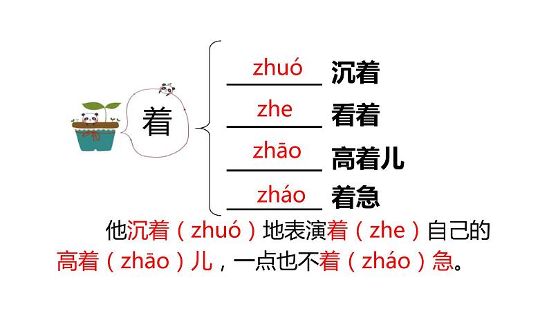 他沉着(zhuó)地表演着(zhe)自己的高着(zhā)儿,一点也不着(zhá)急。