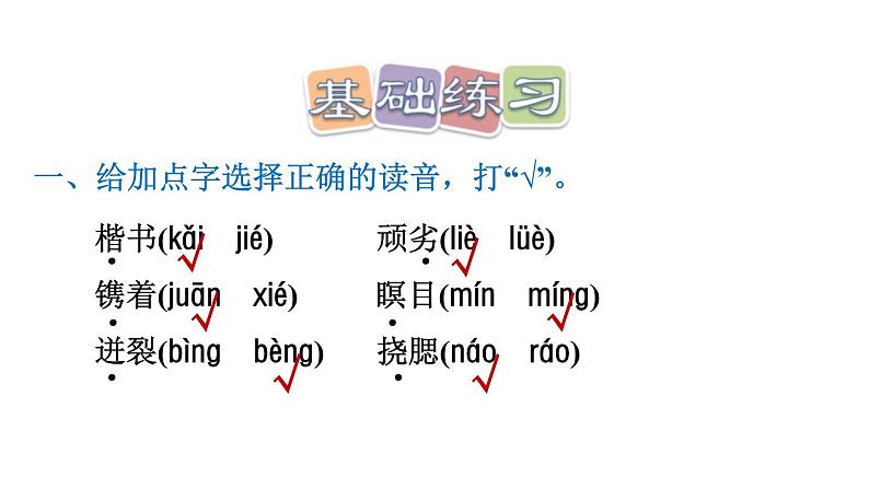 楷书(kǎi jié) 顽劣(liè lüè)镌着(juān xié) 瞑目(mín mínɡ)迸裂(bìnɡ bènɡ) 挠腮(ná rá)