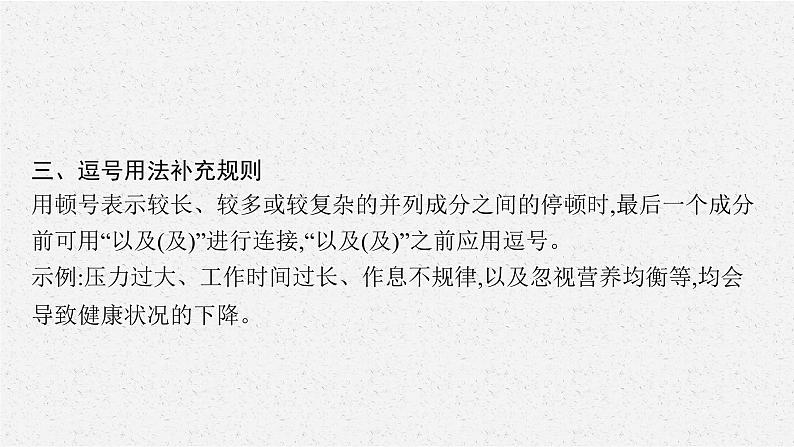 三、逗号用法补充规则用顿号表示较长、较多或较复杂的并列成分之间的停顿时,最后一个成分前可用“以及(及)”进行连接,“以及(及)”之前应用逗号。示例:压力过大、工作时间过长、作息不规律,以及忽视营养均衡等,均会导致健康状况的下降。