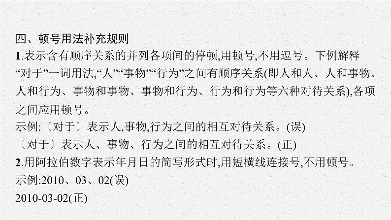 四、顿号用法补充规则1.表示含有顺序关系的并列各项间的停顿,用顿号,不用逗号。下例解释“对于”一词用法,“人”“事物”“行为”之间有顺序关系(即人和人、人和事物、人和行为、事物和事物、事物和行为、行为和行为等六种对待关系),各项之间应用顿号。示例:〔对于〕表示人,事物,行为之间的相互对待关系。(误)〔对于〕表示人、事物、行为之间的相互对待关系。(正)2.用阿拉伯数字表示年月日的简写形式时,用短横线连接号,不用顿号。示例:2010、03、02(误)2010-03-02(正)