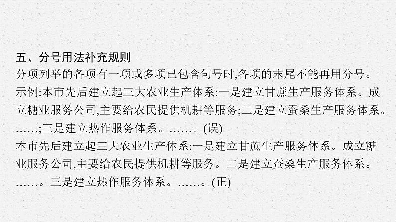 五、分号用法补充规则分项列举的各项有一项或多项已包含句号时,各项的末尾不能再用分号。示例:本市先后建立起三大农业生产体系:一是建立甘蔗生产服务体系。成立糖业服务公司,主要给农民提供机耕等服务;二是建立蚕桑生产服务体系。……;三是建立热作服务体系。……。(误)本市先后建立起三大农业生产体系:一是建立甘蔗生产服务体系。成立糖业服务公司,主要给农民提供机耕等服务。二是建立蚕桑生产服务体系。……。三是建立热作服务体系。……。(正)