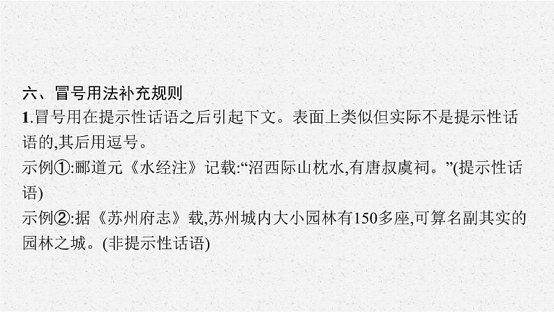 六、冒号用法补充规则1.冒号用在提示性话语之后引起下文。表面上类似但实际不是提示性话语的,其后用逗号。示例①:郦道元《水经注》记载:“沼西际山枕水,有唐叔虞祠。”(提示性话语)示例②:据《苏州府志》载,苏州城内大小园林有150多座,可算名副其实的园林之城。(非提示性话语)