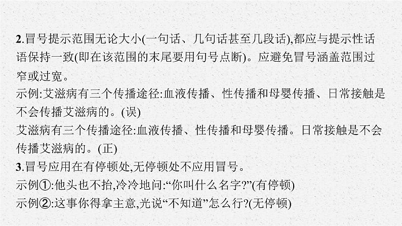 2.冒号提示范围无论大小(一句话、几句话甚至几段话),都应与提示性话语保持一致(即在该范围的末尾要用句号点断)。应避免冒号涵盖范围过窄或过宽。示例:艾滋病有三个传播途径:血液传播、性传播和母婴传播、日常接触是不会传播艾滋病的。(误)艾滋病有三个传播途径:血液传播、性传播和母婴传播。日常接触是不会传播艾滋病的。(正)3.冒号应用在有停顿处,无停顿处不应用冒号。示例①:他头也不抬,冷冷地问:“你叫什么名字?”(有停顿)示例②:这事你得拿主意,光说“不知道”怎么行?(无停顿)