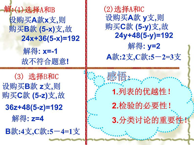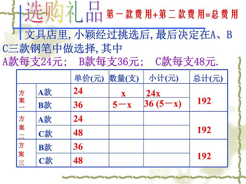 若小颖想同时购买其中两款不同的钢笔共5支,用去192元,请你帮小颖设计一种购买方案。
