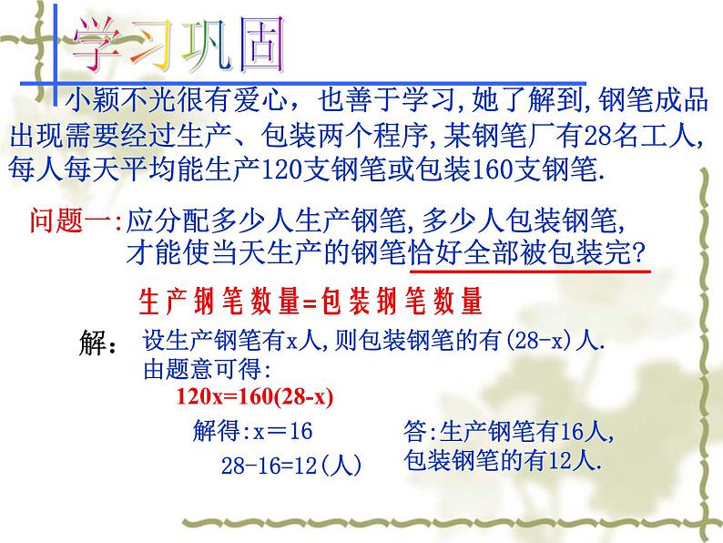 设生产钢笔有x人,则包装钢笔的有(28-x)人.由题意可得: