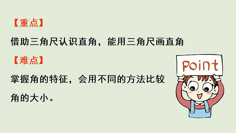 【重点】借助三角尺认识直角,能用三角尺画直角。【难点】掌握角的特征,会用不同的方法比较角的大小。