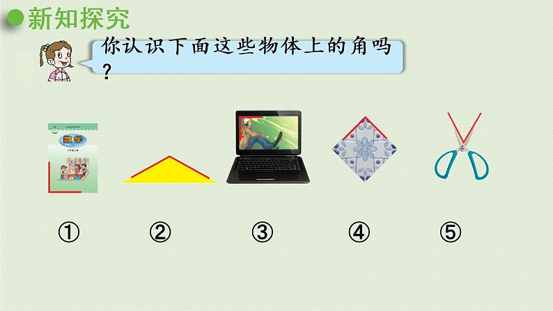 展开结合生活情境认识直角,通过折一折、拼一拼、比 一比等活动加深对直角的认识。2. 学会辨认直角,能够在比较角的大小的过程中体验 到所有的直角都是一样大的。3. 通过折一折、画一画、比一比,知道角的大小和角 的两条边没有关系。