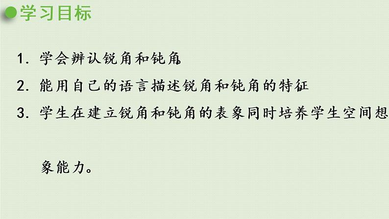 学会辨认锐角和钝角。能用自己的语言描述锐角和钝角的特征。学生在建立锐角和钝角的表象同时培养学生空间想 象能力。
