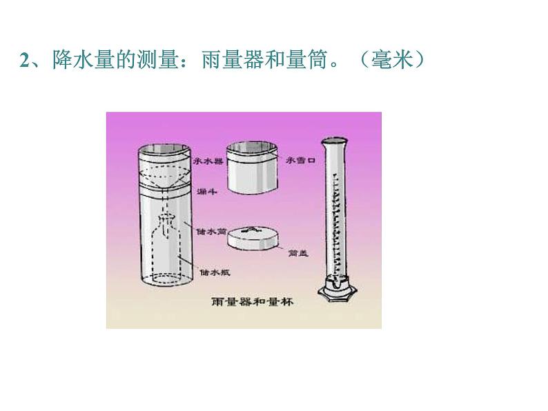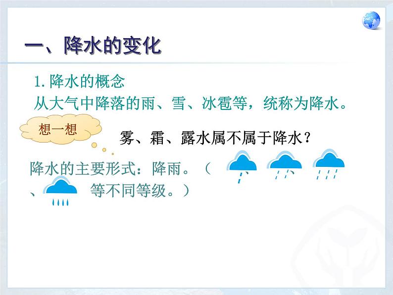 1.降水的概念 从大气中降落的雨、雪、冰雹等,统称为降水。