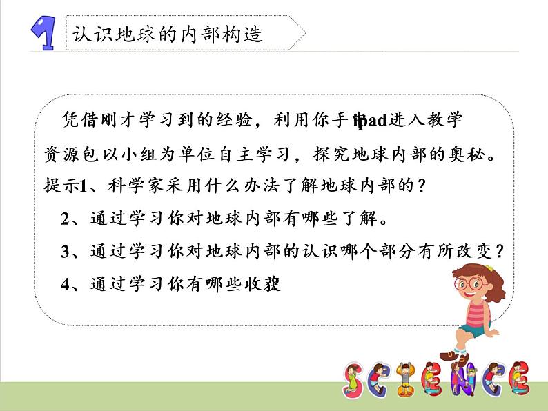 凭借刚才学习到的经验,利用你手中ipad进入教学资源包以小组为单位自主学习,探究地球内部的奥秘。提示1、科学家采用什么办法了解地球内部的? 2、通过学习你对地球内部有哪些了解。 3、通过学习你对地球内部的认识哪个部分有所改变? 4、通过学习你有哪些收获?