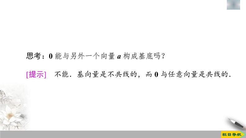 这是一份高中数学人教A版 (2019)必修 第二册6.3 平面向量基本定理及坐标表示习题课件ppt,共46页。PPT课件主要包含了不共线向量,对基底的理解,用基底表示向量,点击右图进入等内容,欢迎下载使用。