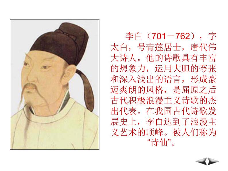 李白(701-762),字太白,号青莲居士,唐代伟大诗人。他的诗歌具有丰富的想象力,运用大胆的夸张和深入浅出的语言,形成豪迈爽朗的风格,是屈原之后古代积极浪漫主义诗歌的杰出代表。在我国古代诗歌发展史上,李白达到了浪漫主义艺术的顶峰。被人们称为“诗仙”。