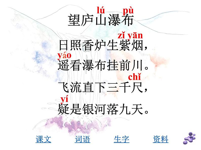 zǐ yān日照香炉生紫烟, yá 遥看瀑布挂前川。 chǐ 飞流直下三千尺, yí 疑是银河落九天。