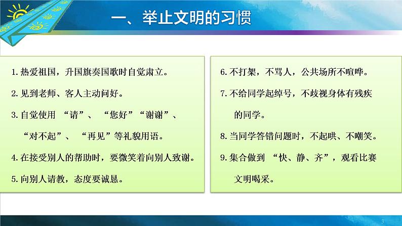 6.不打架,不骂人,公共场所不喧哗。 7.不给同学起绰号,不歧视身体有残疾 的同学。 8.当同学答错问题时,不起哄、不嘲笑。 9.集合做到 “快、静、齐”,观看比赛 文明喝采。