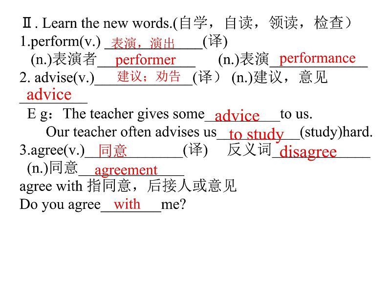 Ⅱ. Learn the new wrds.(自学,自读,领读,检查)1.perfrm(v.) _____________(译) (n.)表演者_____________ (n.)表演_____________2. advise(v.)_____________(译) (n.)建议,意见_________ E g:The teacher gives sme__________t us. Our teacher ften advises us___________(study)(v.)_____________(译) 反义词_____________ (n.)同意______________agree with 指同意,后接人或意见D yu agree________me?
