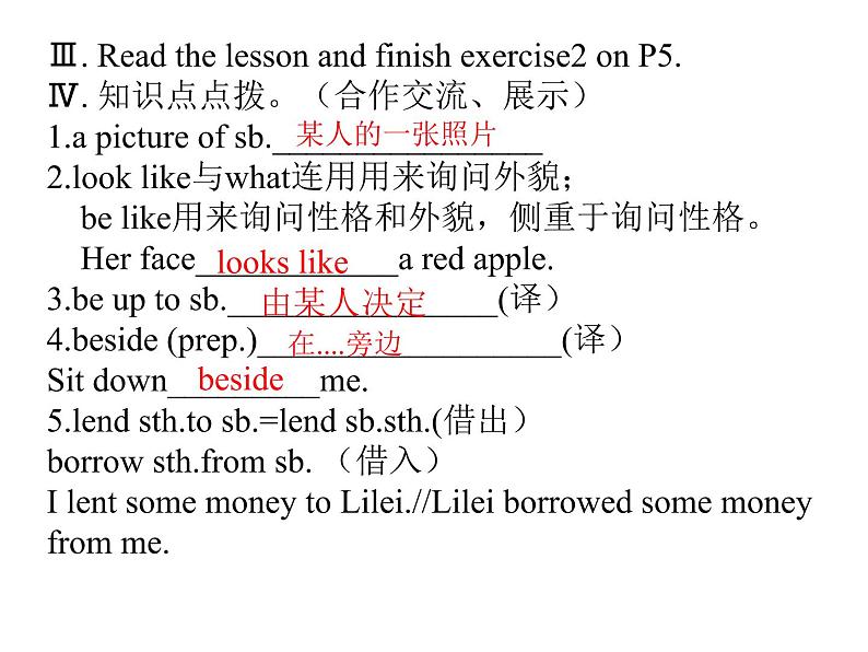 Ⅲ. Read the lessn and finish exercise2 n P5.Ⅳ. 知识点点拨。(合作交流、展示)1.a picture f like与what连用用来询问外貌; be like用来询问性格和外貌,侧重于询问性格。 Her face____________a red up t sb.________________(译)4.beside (prep.)__________________(译)Sit sth.t sb.=lend sb.sth.(借出)brrw sth.frm sb. (借入)I lent sme mney t Lilei.//Lilei brrwed sme mney frm me.