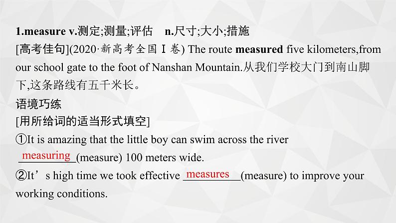 1.measure v.测定;测量;评估 n.尺寸;大小;措施[高考佳句](2020·新高考全国Ⅰ卷) The rute measured five kilmeters,frm ur schl gate t the ft f Nanshan Muntain.从我们学校大门到南山脚下,这条路线有五千米长。语境巧练[用所给词的适当形式填空]①It is amazing that the little by can swim acrss the river (measure) 100 meters wide. ②It’s high time we tk effective (measure) t imprve yur wrking cnditins.