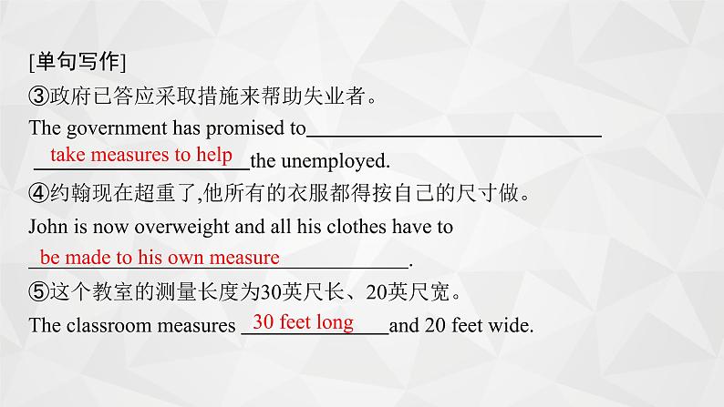 [单句写作]③政府已答应采取措施来帮助失业者。The gvernment has prmised t the unemplyed. ④约翰现在超重了,他所有的衣服都得按自己的尺寸做。Jhn is nw verweight and all his clthes have t . ⑤这个教室的测量长度为30英尺长、20英尺宽。The classrm measures and 20 feet wide.