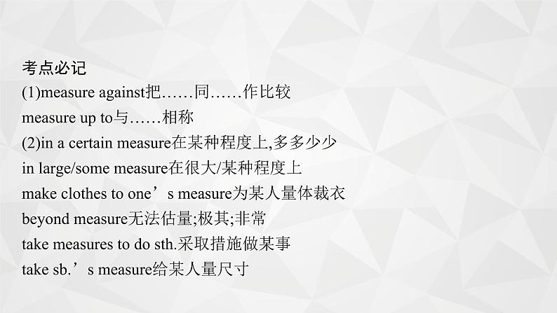 考点必记(1)measure against把……同……作比较measure up t与……相称(2)in a certain measure在某种程度上,多多少少in large/sme measure在很大/某种程度上make clthes t ne’s measure为某人量体裁衣beynd measure无法估量;极其;非常take measures t d sth.采取措施做某事take sb.’s measure给某人量尺寸