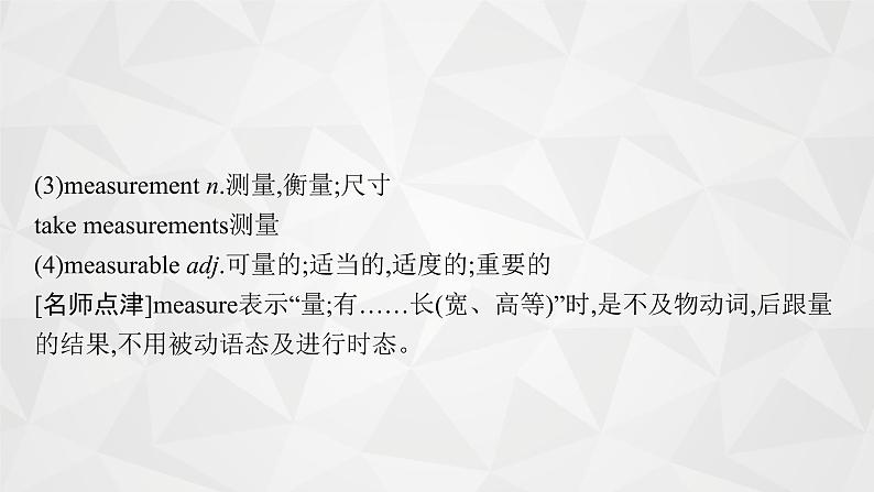 (3)measurement n.测量,衡量;尺寸take measurements测量(4)measurable adj.可量的;适当的,适度的;重要的[名师点津]measure表示“量;有……长(宽、高等)”时,是不及物动词,后跟量的结果,不用被动语态及进行时态。