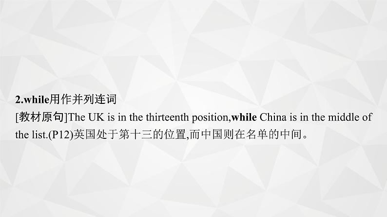2.while用作并列连词[教材原句]The UK is in the thirteenth psitin,while China is in the middle f the list.(P12)英国处于第十三的位置,而中国则在名单的中间。
