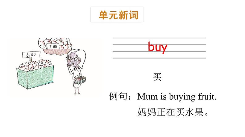 例句:Mum is buying fruit. 妈妈正在买水果。