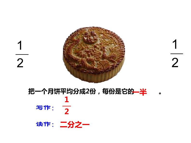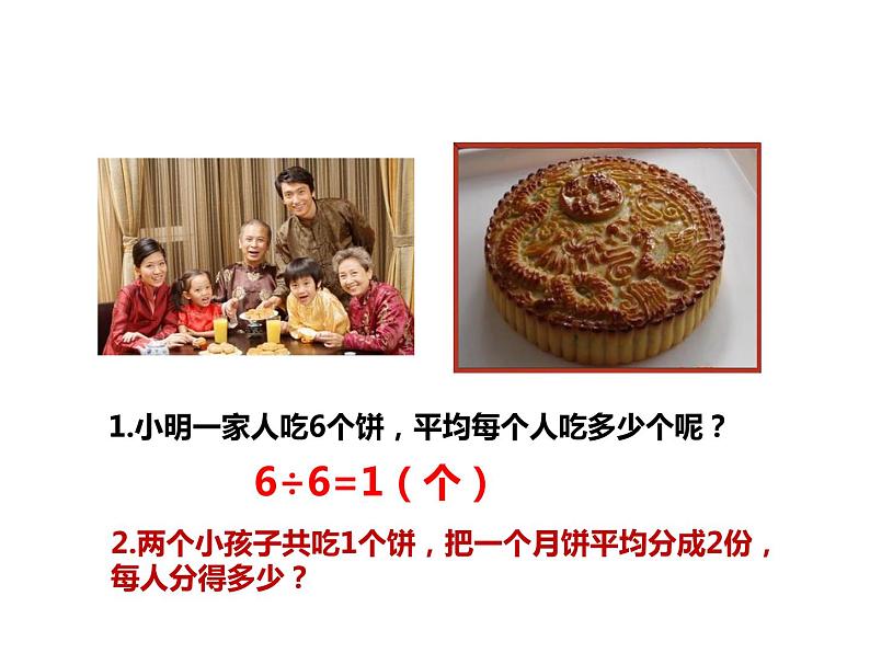 2.两个小孩子共吃1个饼,把一个月饼平均分成2份,每人分得多少?