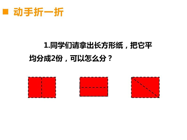 1.同学们请拿出长方形纸,把它平均分成2份,可以怎么分?