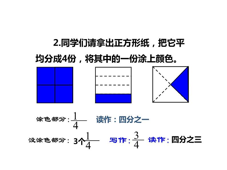 2.同学们请拿出正方形纸,把它平均分成4份,将其中的一份涂上颜色。