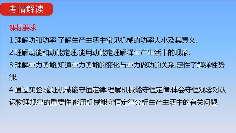 课标要求1.理解功和功率.了解生产生活中常见机械的功率大小及其意义.2.理解动能和动能定理.能用动能定理解释生产生活中的现象.3.理解重力势能,知道重力势能的变化与重力做功的关系.定性了解弹性势能.4.通过实验,验证机械能守恒定律.理解机械能守恒定律,体会守恒观念对认识物理规律的重要性.能用机械能守恒定律分析生产生活中的有关问题.