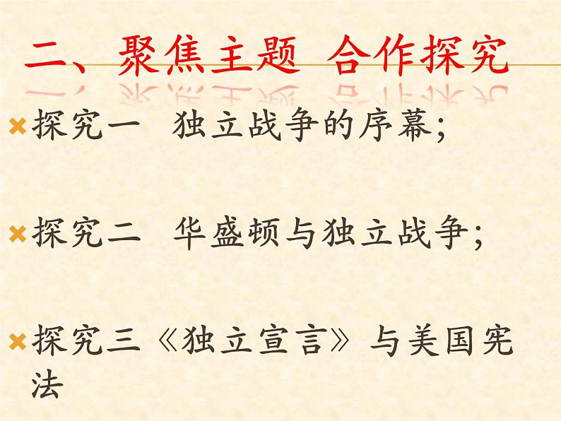 探究一 独立战争的序幕;探究二 华盛顿与独立战争;探究三《独立宣言》与美国宪法