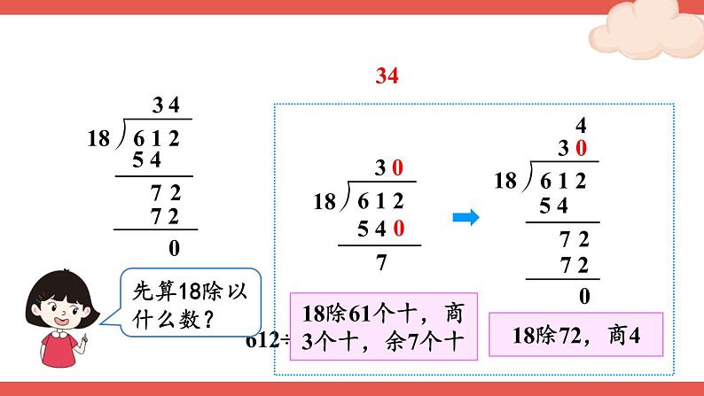 这是一份小学数学笔算除法教学ppt课件,共12页。PPT课件主要包含了复习旧知,商是三位数,商是两位数,商是一位数,探索新知,除72商4,先算18除什么数,巩固练习,课堂小结,作业设计等内容,欢迎下载使用。