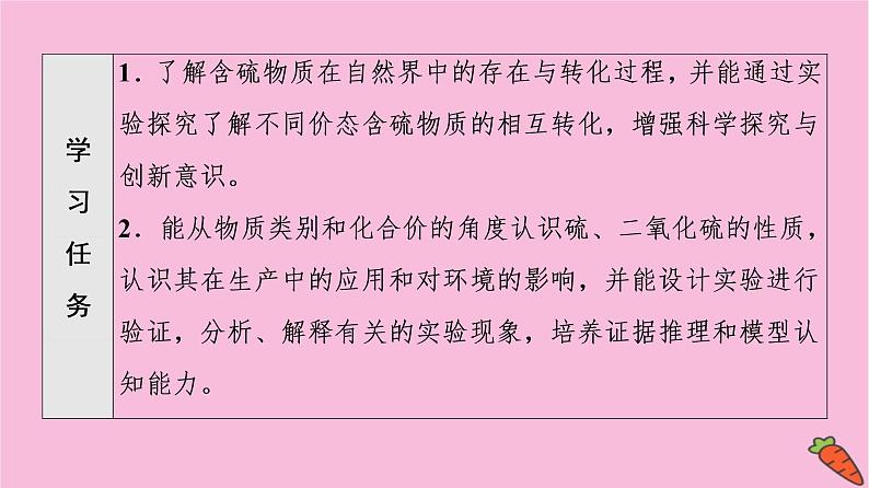 高中化学鲁科版 (2019)必修 第一册第2节 硫的转化图片课件ppt: 这是一份高中化学鲁科版 (2019)必修 第一册第2节 硫的转化图片课件ppt,共46页。PPT课件主要包含了任务分项突破,课堂小结提升,学科素养测评,自主梳理,SO3,H2SO4,Na2SO4,SO2,H2SO3,Na2SO3等内容,欢迎下载使用。