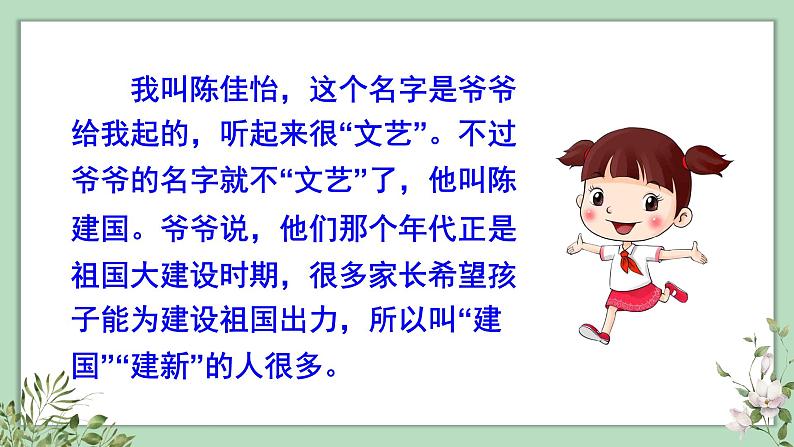 我叫陈佳怡,这个名字是爷爷给我起的,听起来很“文艺”。不过爷爷的名字就不“文艺”了,他叫陈建国。爷爷说,他们那个年代正是祖国大建设时期,很多家长希望孩子能为建设祖国出力,所以叫“建国”“建新”的人很多。