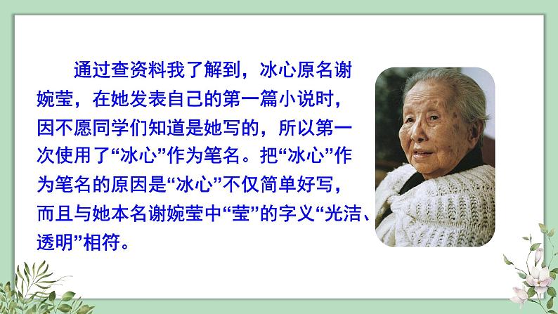 通过查资料我了解到,冰心原名谢婉莹,在她发表自己的第一篇小说时,因不愿同学们知道是她写的,所以第一次使用了“冰心”作为笔名。把“冰心”作为笔名的原因是“冰心”不仅简单好写,而且与她本名谢婉莹中“莹”的字义“光洁、透明”相符。