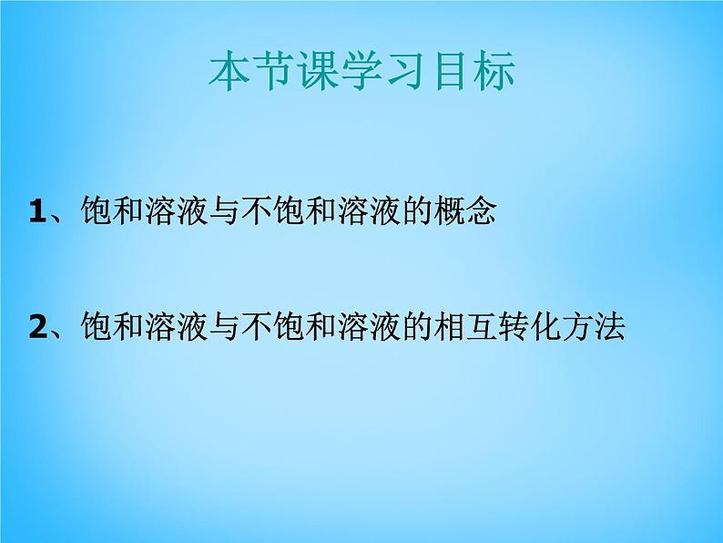 1、饱和溶液与不饱和溶液的概念2、饱和溶液与不饱和溶液的相互转化方法