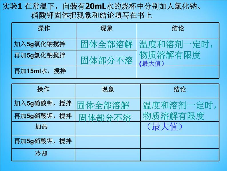 实验1 在常温下,向装有20mL水的烧杯中分别加人氯化钠、 硝酸钾固体把现象和结论填写在书上