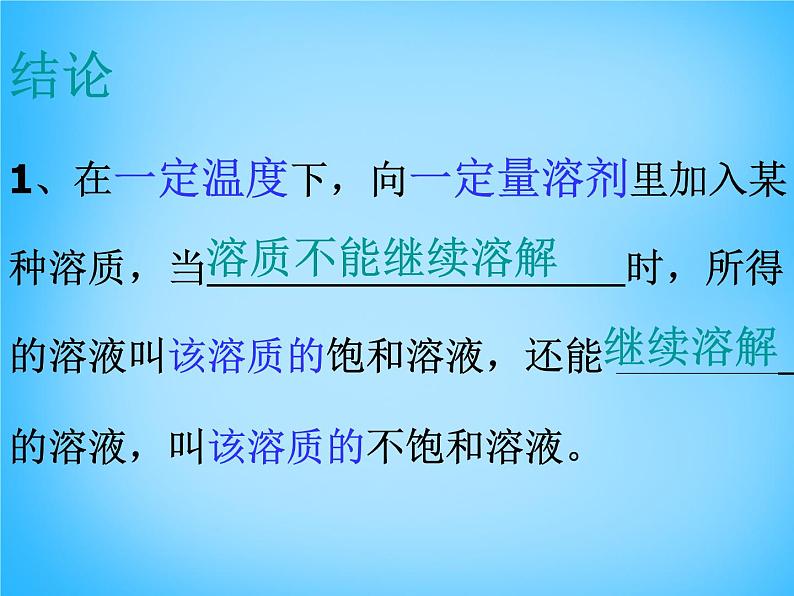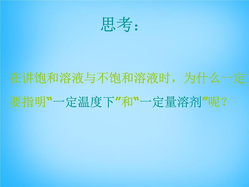因此,只有指明“一定量溶剂”和“ 一定温度下”,溶液的“饱和”和“不饱和”才有确定的意义。