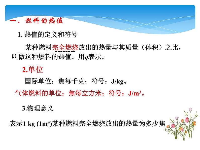表示1 kg (1m3)某种燃料完全燃烧放出的热量为多少焦