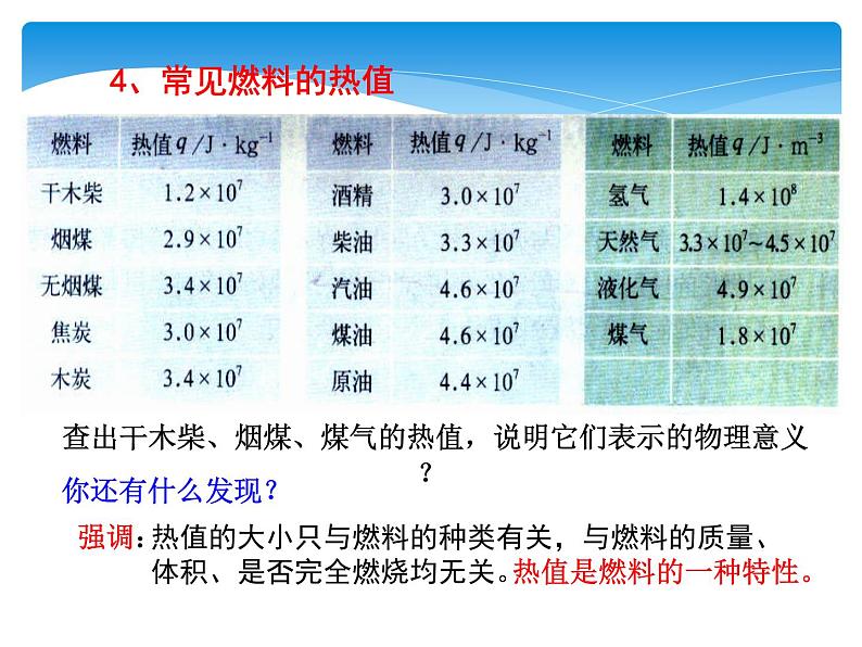 查出干木柴、烟煤、煤气的热值,说明它们表示的物理意义?