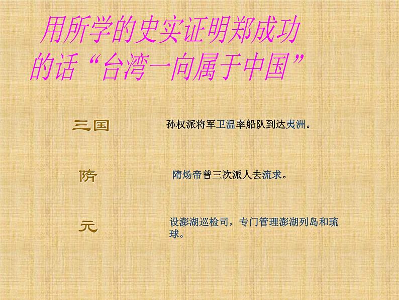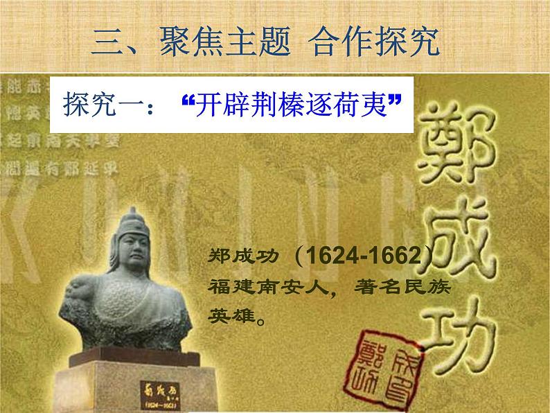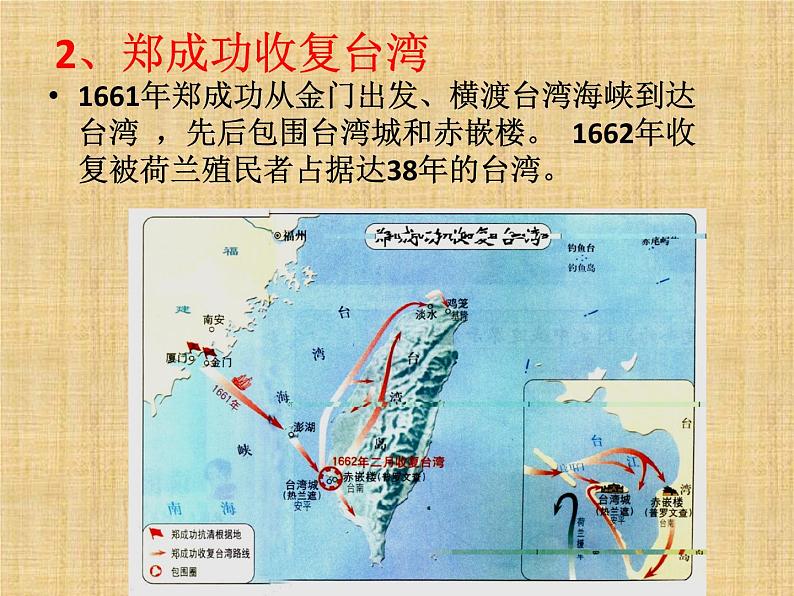 这是一份初中历史第18课 统一多民族国家的巩固和发展教课内容课件ppt,共53页。PPT课件主要包含了清朝前期疆域和政区图,清朝对全国的统治,民族英雄,开辟荆榛逐荷夷,开发台湾的先驱,管辖台湾,明朝后期,1662年,1684年,台湾自古是我国的领土等内容,欢迎下载使用。