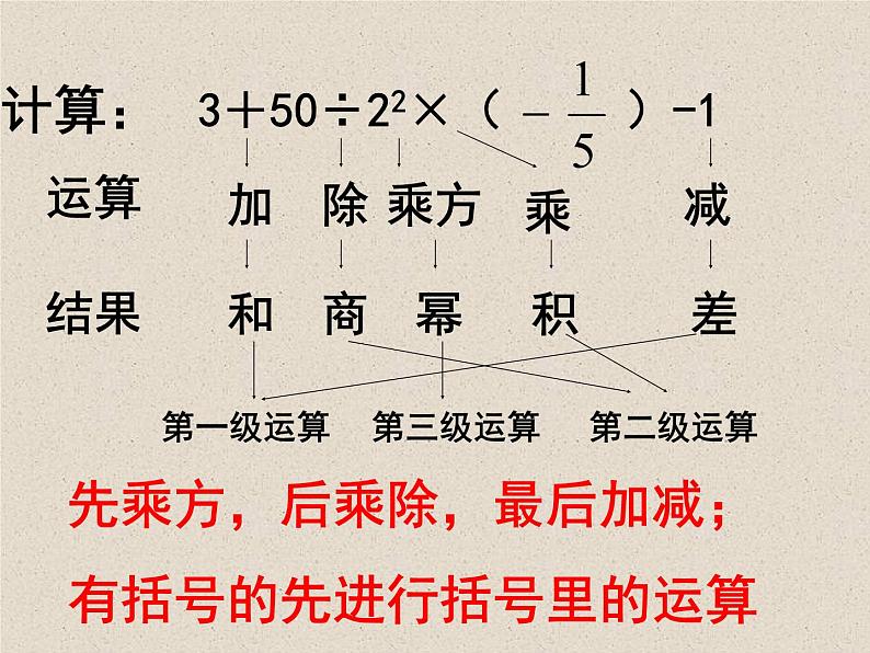 先乘方,后乘除,最后加减;有括号的先进行括号里的运算