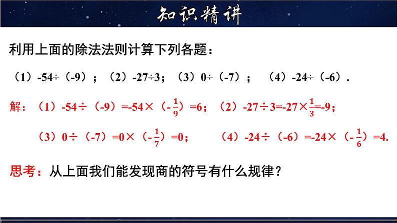 利用上面的除法法则计算下列各题:(1)-54÷(-9);(2)-27÷3;(3)0÷(-7); (4)-24÷(-6).