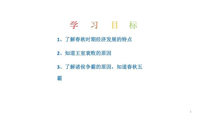 1、了解春秋时期经济发展的特点2、知道王室衰败的原因3、了解诸侯争霸的原因,知道春秋五霸
